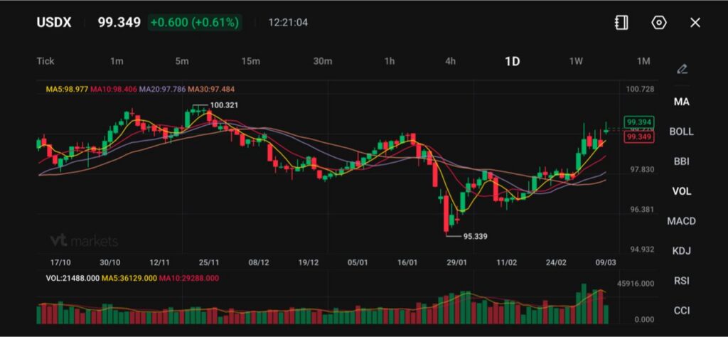 សន្ទស្សន៍ប្រាក់ដុល្លារ (US Dollar Index ឬ USDX) កំពុងជួញដូរជិត 99.35 កើនប្រហែល 0.61% ខណៈដុល្លារបន្តរឹងមាំ បន្ទាប់ពីត្រឡប់ឡើងពីចំណុចទាបចុងខែមករាជិត 95.34។ (USDX ជាសន្ទស្សន៍វាស់កម្លាំងដុល្លារប្រៀបធៀបនឹងកញ្ចប់រូបិយប័ណ្ណធំៗ) សន្ទស្សន៍បានឡើងជាបន្តបន្ទាប់ក្នុងវគ្គជួញដូរថ្មីៗ បង្ហាញថាមានតម្រូវការទិញដុល្លារត្រឡប់មកវិញ បន្ទាប់ពីអស់កម្លាំងនៅដើមឆ្នាំ។