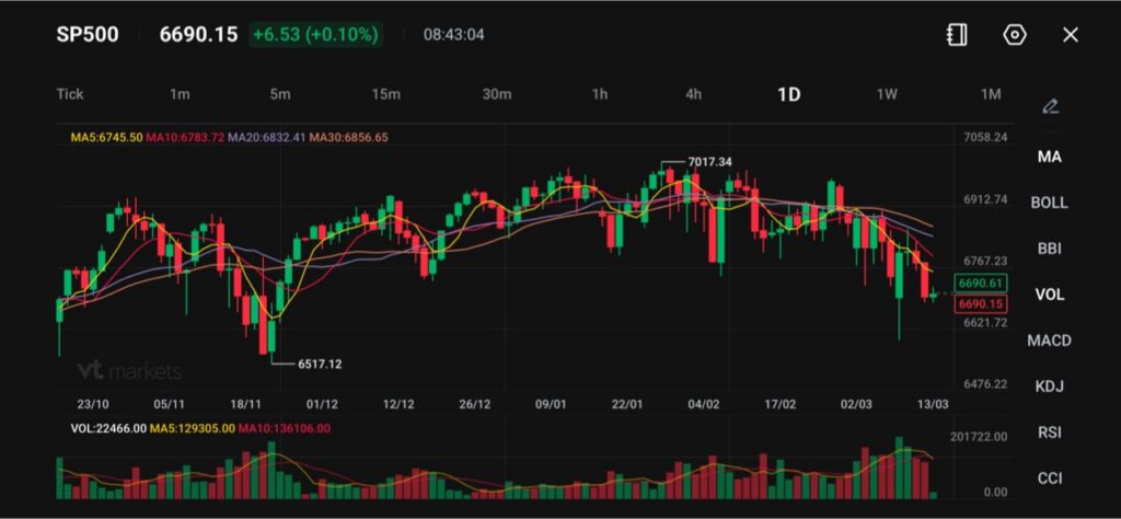 S&P 500 កំពុងជួញដូរជិត 6,690 កើនបន្តិច 0.10% ក្នុងវគ្គជួញដូរនេះ ខណៈសន្ទស្សន៍ព្យាយាមស្ថេរភាព បន្ទាប់ពីធ្លាក់ពីកំពូល 7,017។ រចនាសម្ព័ន្ធទូទៅបង្ហាញថា ទីផ្សារបានប្តូរពីកម្លាំងឡើងមុននេះ ទៅដំណាក់កាលកែតម្រូវខ្លី (corrective phase មានន័យថា តម្លៃថយ/កែបន្ទាប់ពីឡើងខ្លាំង) ដោយតម្លៃកំពុងសាកល្បងកម្រិតគាំទ្រទាបៗ។