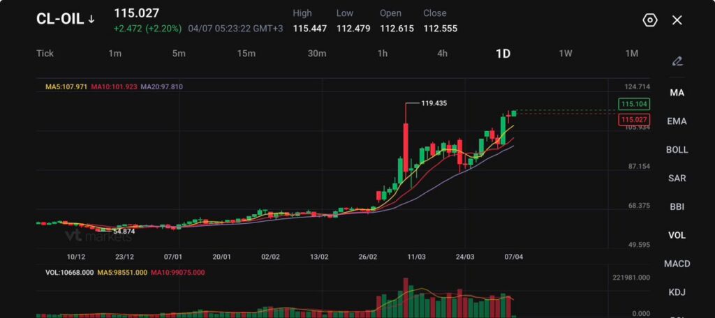 តម្លៃប្រេងឆៅនៅតែបង្ហាញថា ហានិភ័យខាងផ្គត់ផ្គង់មិនទាន់ធូរស្រាល។ CL-OIL នៅតែឈរលើ 115 ខណៈទីផ្សារកិច្ចសន្យា futures ទូលំទូលាយនៅតែរឹងមាំ ពេលអ្នកជួញដូររង់ចាំថ្ងៃកំណត់នៅថ្ងៃអង្គារ ដែល Trump ដាក់សម្រាប់កិច្ចព្រមព្រៀងជាមួយអ៊ីរ៉ង់។