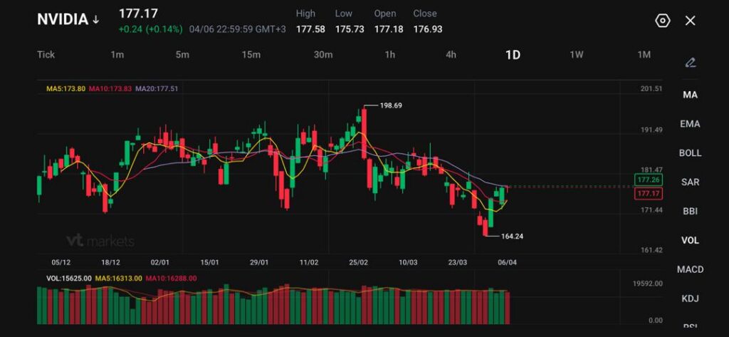 - NVIDIA ជួញដូរនៅ 177.17 កើន 0.24 (+0.14%) ខណៈទីផ្សារធំទូលាយកំពុងចូលរដូវប្រកាសលទ្ធផល (earnings season = រដូវដែលក្រុមហ៊ុនប្រកាសប្រាក់ចំណេញ/ចំណូលប្រចាំត្រីមាស) ហើយការដឹកនាំទីផ្សារនៅតែប្រមូលផ្ដុំក្នុងវិស័យបច្ចេកវិទ្យា និងហិរញ្ញវត្ថុ។