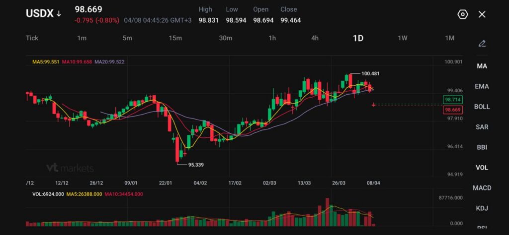 USDX ធ្លាក់ ព្រោះទីផ្សារដកចេញផ្នែកមួយនៃ “តម្លៃបន្ថែមដោយសារសុវត្ថិភាព” (safe-haven premium = តម្លៃបន្ថែមដែលដុល្លារឡើងពេលមនុស្សភ័យ) បន្ទាប់ពី Trump ពន្យារពេលការគំរាមវាយប្រហារលើហេដ្ឋារចនាសម្ព័ន្ធស៊ីវិលរបស់អ៊ីរ៉ង់ 2 សប្ដាហ៍ និងហៅថា “បទឈប់បាញ់ទ្វេភាគី”។ នេះកាត់បន្ថយតម្រូវការដុល្លារជាទ្រព្យការពារហានិភ័យ។