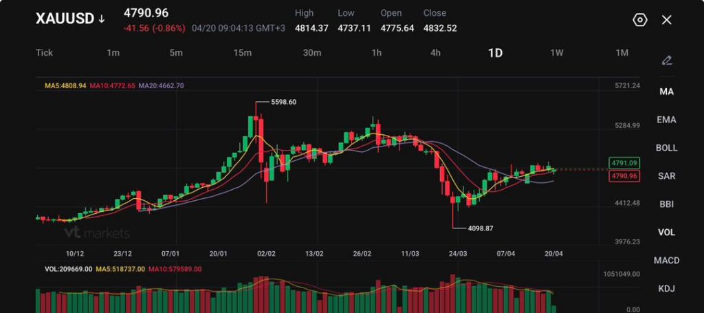 - XAUUSD ជួញដូរនៅ 4,790.96 ធ្លាក់ 41.56 (-0.86%) បន្ទាប់ពីឡើងដល់ 4,814.37 ហើយធ្លាក់ទៅ 4,737.11។ (XAUUSD គឺតម្លៃ “មាស/ដុល្លារ” ក្នុងទីផ្សារ)