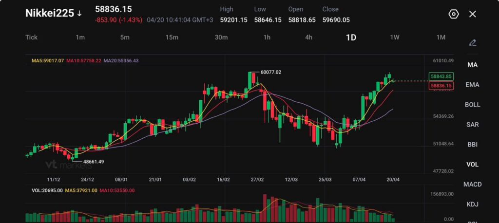 ព្រោះអ្នកជួញដូរនៅតែផ្តល់អាទិភាពទៅលើការរំពឹងចំណេញដែលបានជំរុញដោយ AI និងកម្លាំងពីវ៉ូលស្ទ្រីត ជាងការឡើងចុះតាមព័ត៌មានមជ្ឈិមបូព៌ា។ Nikkei ទើបបិទនៅ 58,824.89 ដែលនៅជិតតំបន់កំពូលក្នុងថ្ងៃសប្ដាហ៍មុន។