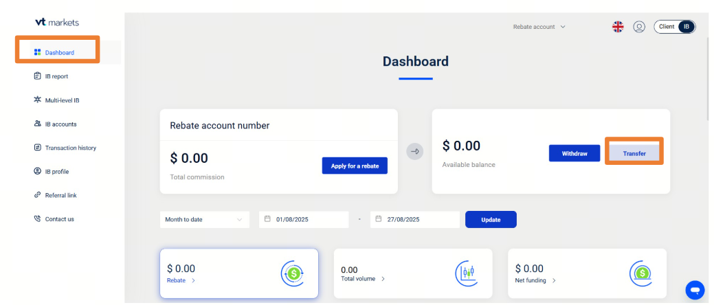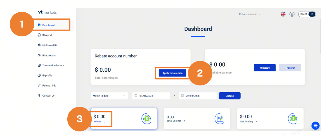 ដំបូង សូម ដាក់ពាក្យចូលរួម កម្មវិធី VT Markets IB។ បន្ទាប់ពីអនុម័ត និងបង្កើតគណនីរួច អ្នកនឹងចូលប្រើ Client Portal ឬ IB Portal ដើម្បីគ្រប់គ្រងសកម្មភាពដៃគូ។