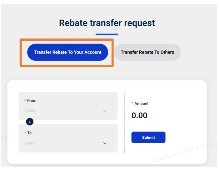 - នៅទំព័រ Rebate transfer request ជ្រើស Transfer Rebate To Your Account (ផ្ទេរប្រាក់ទៅគណនីខ្លួនឯង)។