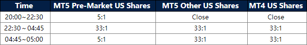 2. 20 Pre-market US shares on MT5: Leverage will be 5:1 during 22:45-23:00 and 14:00-16:30 ; and remain 33:1 during the rest of the trading time.