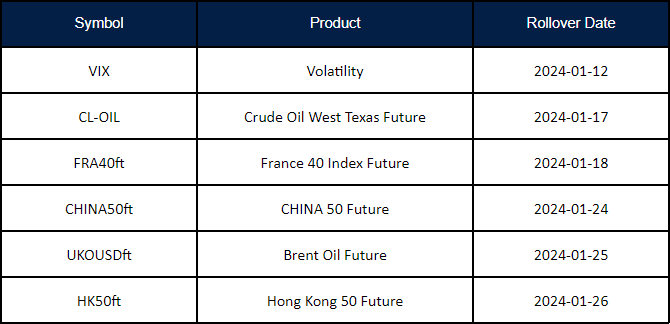 • Positions that are open on the expiration date will be adjusted via a rollover charge or credit to reflect the price difference between the expiring and new contracts.