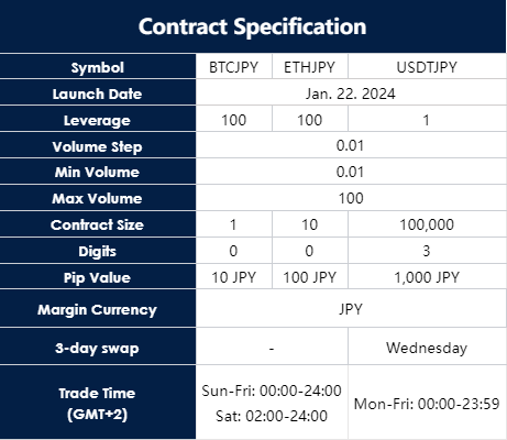 1. The swap for BTCJPY and ETHJPY is charged on a daily basis, including weekends, without a 3-day swap.