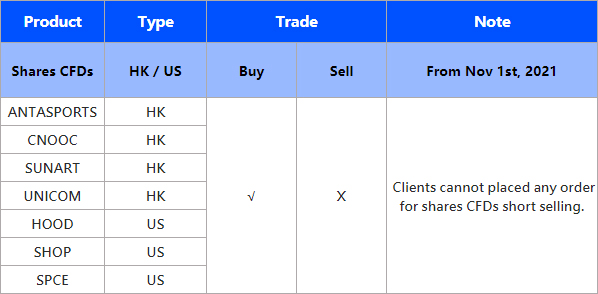 VT Markets is devoted to offering a favorable trading environment to our clients. After a punctilious assessment, from Nov. 1st, 2021, clients will be only available for long positions on certain products.