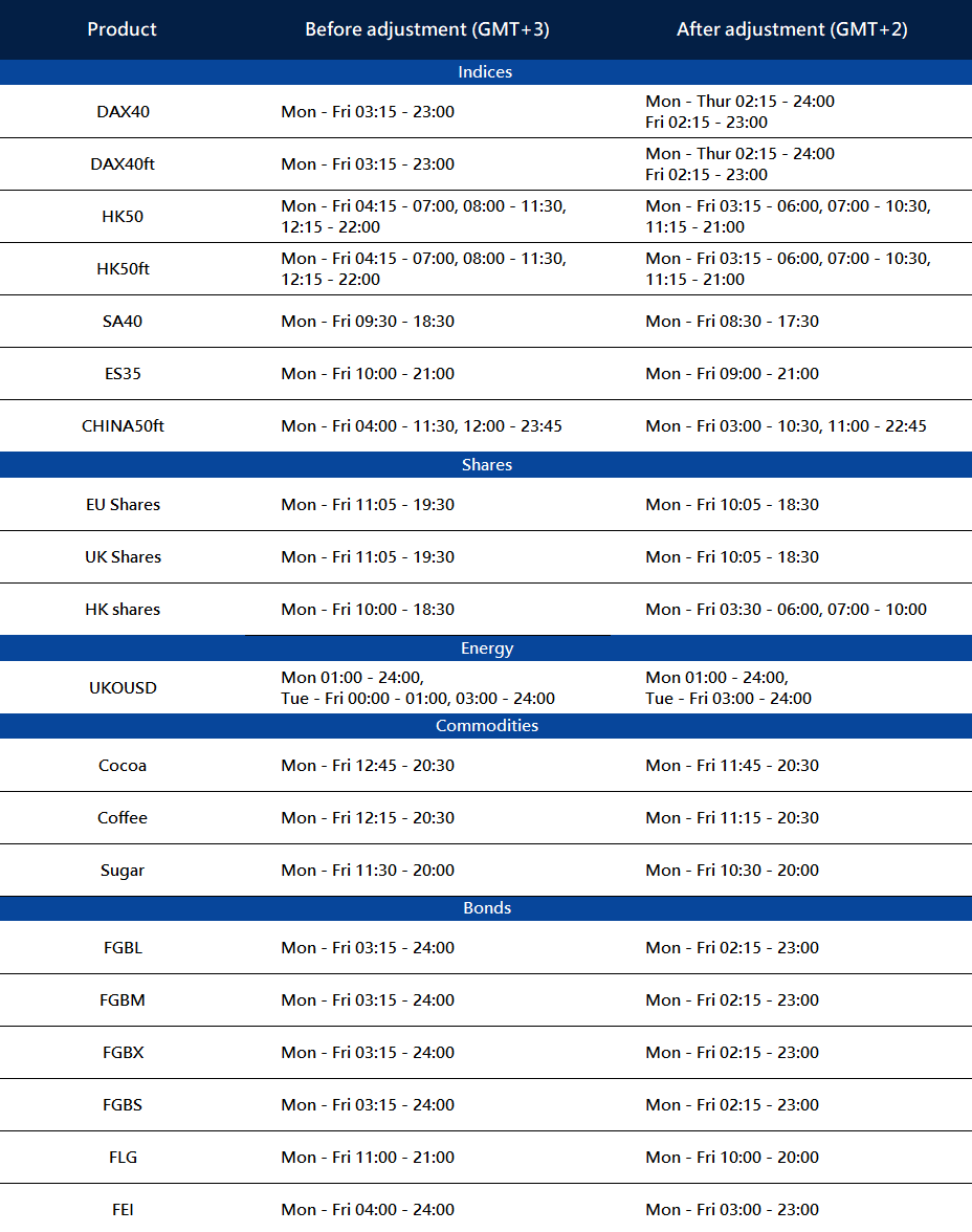 With the standard time commencing in the US on 7 November, there will be changes to the trading hours for certain products on MT4/MT5.