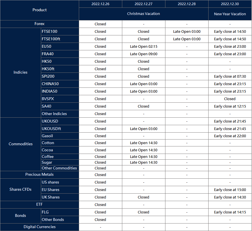 Please note that the following instruments’ trading hours will be affected by the upcoming holidays.